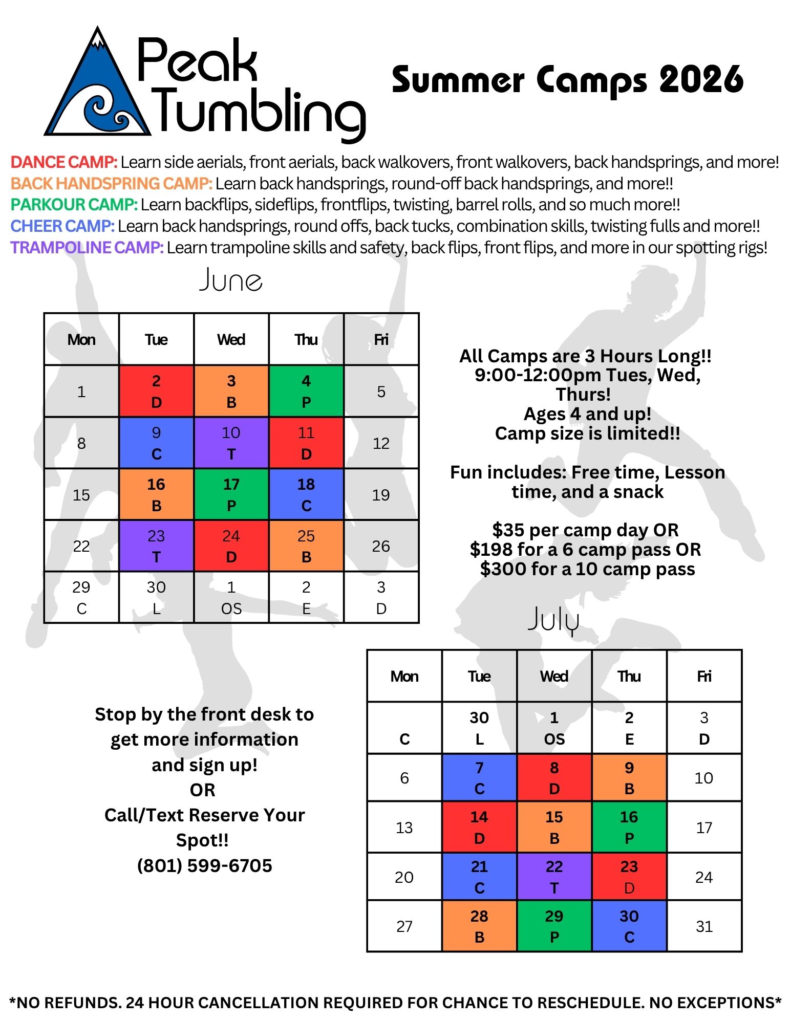 Summer Camps Our 2026 schedule is now available. Book soon to reserve your spots, we do fill up! kids summer camps tumbling dance cheer parkour